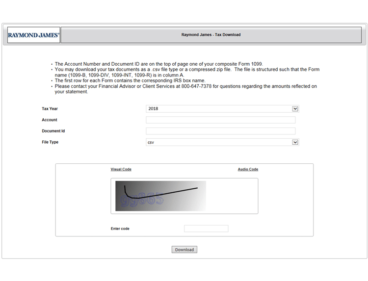To use the service, simply follow the steps outlined below by choosing Raymond James from the Brokerage then enter the document identification number printed on your composite Form 1099 statement as directed. This “key” provides access to a summary of your Form.